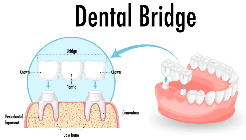 A dental bridge is a false tooth (called a pontic) that is held in place for the missing tooth. The pontic(s) is connected to the anchorage crowns on either side of the gap. Implants is another option for missing teeth.