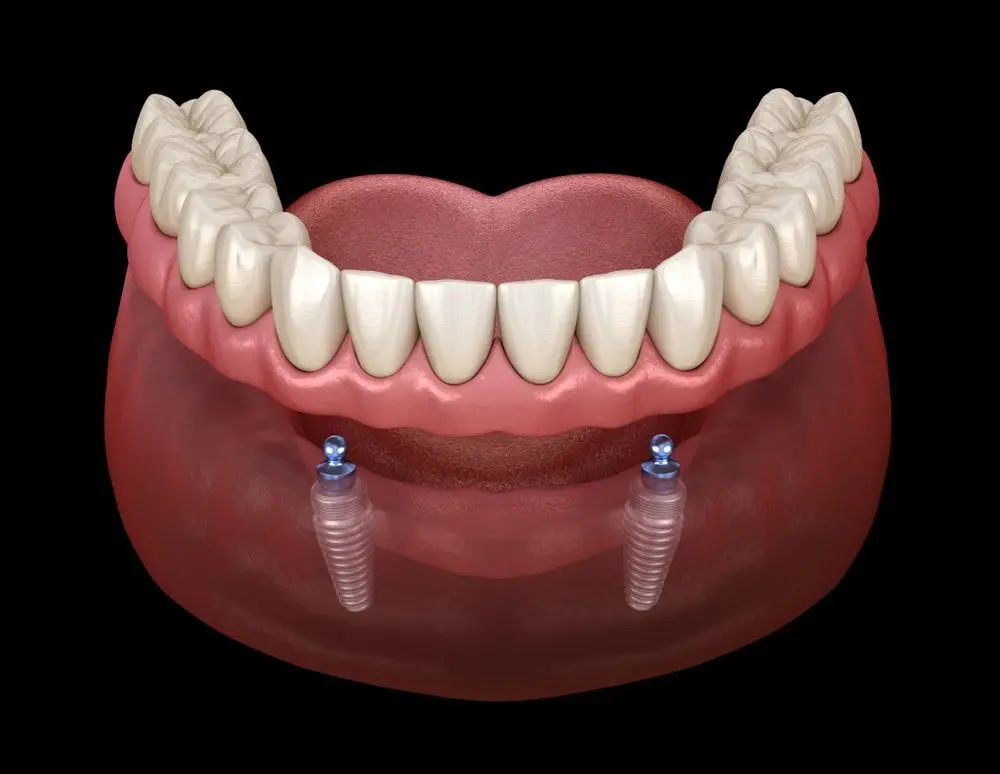 A two-implant overdenture is a removable denture that securely attaches to two dental implants, most commonly placed in the lower jaw. This solution offers improved stability, comfort, and function compared to traditional dentures, while still being easy to remove for daily cleaning.